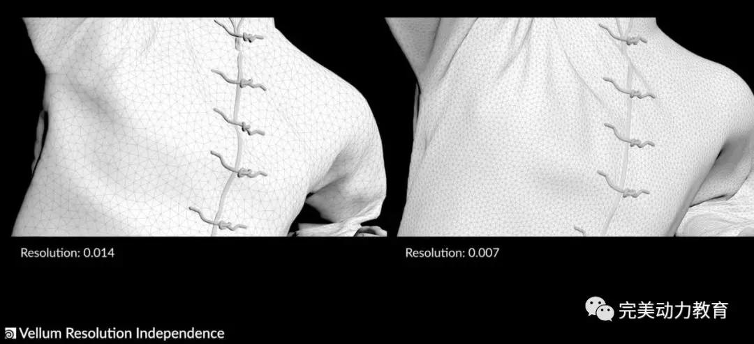 我們都知道,解算布料效果跟布料模型的布線有很大關系,比如時常碰到模型布線有問題或是精度不夠。而這次的Vellum更新,讓解算精度與模型布線脫離,也就是這個“Resolution Independence”,不管模型布線是啥樣的,解算精度是想加多少就有多少~
