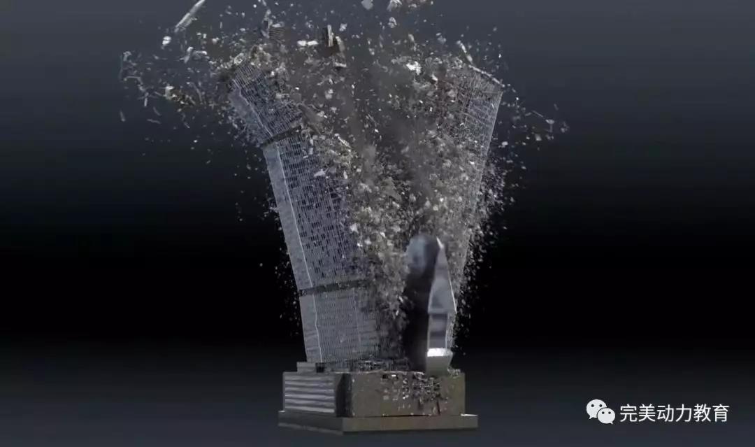 注意看這個大樓劈成兩半的截圖里面的橙色方框,看似這一攤碎塊毫不相干,但其實這個過程是被橙色方框整體被劈開的運動引導。