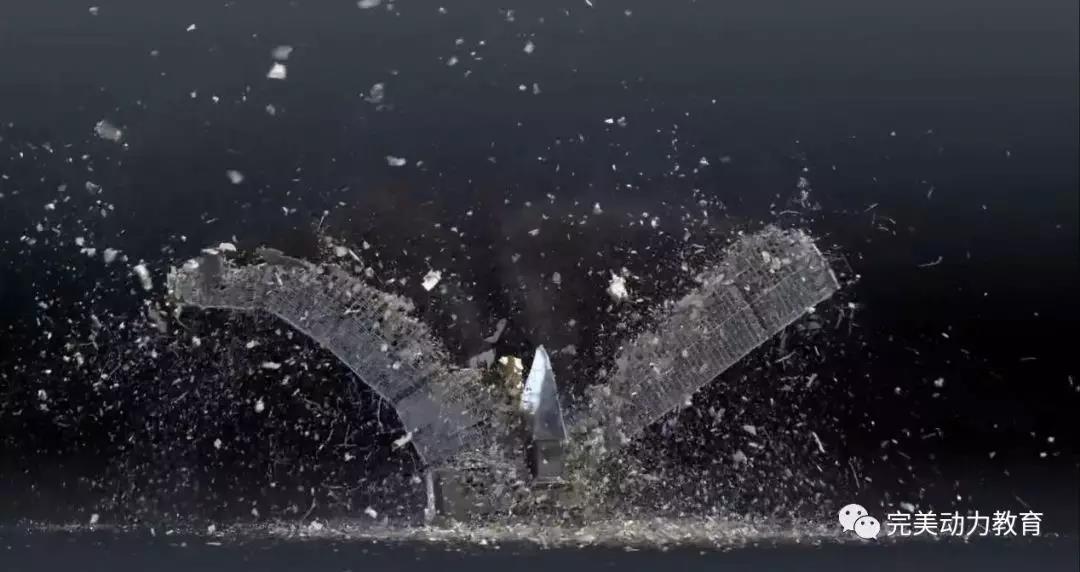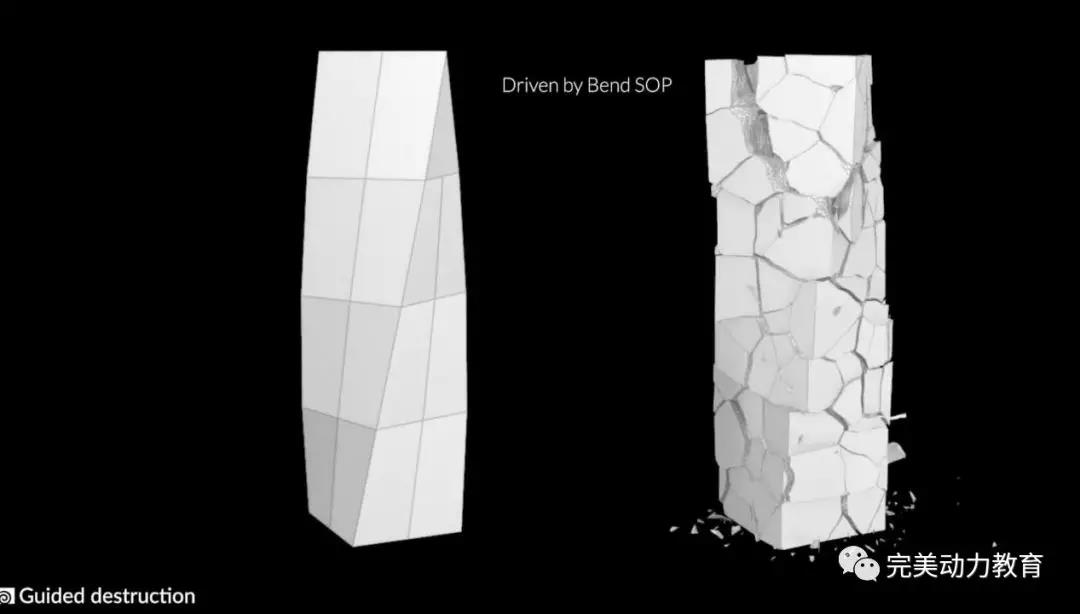 而下面這張圖的剛體破碎是被SOP中的bend運動引導,也就是說,你只需要先模擬出左圖中的運動(可以是SOP變形,可以是FEM解算后,亦或是外部動畫導入),就可以用左圖的運動去驅(qū)動破碎,讓剛體自熱而然的在這種形變中產(chǎn)生真實的碎裂!