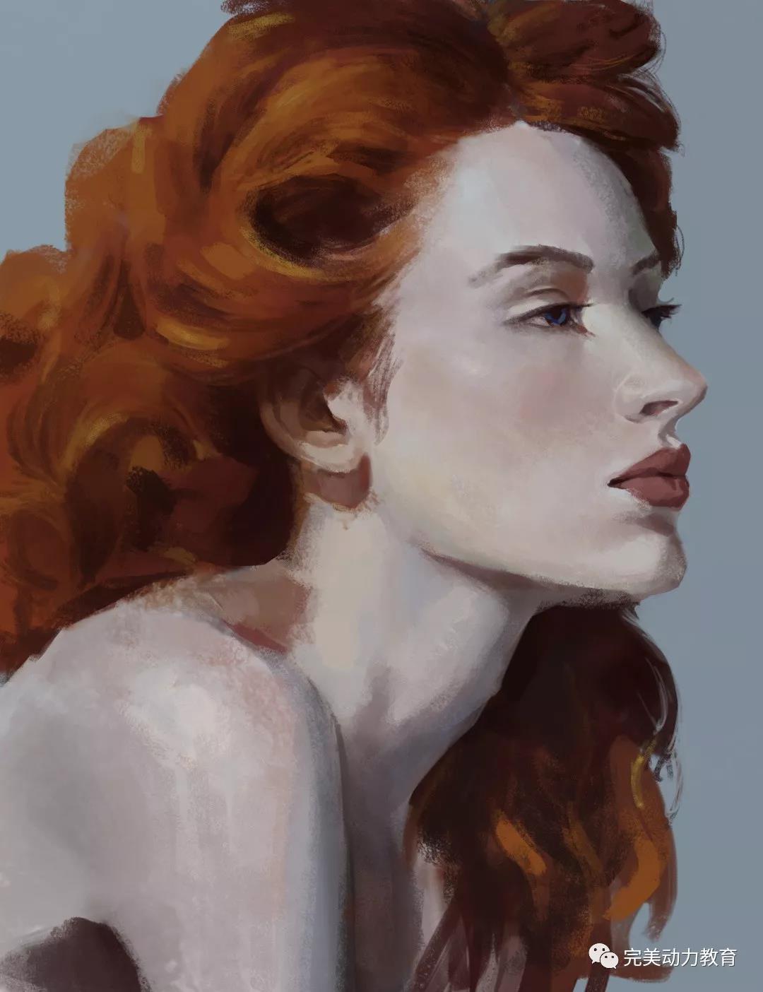 5.花最后的時(shí)間來刻畫一點(diǎn)點(diǎn)質(zhì)感,畫面中只有皮膚和毛發(fā)兩種大面積的質(zhì)感。皮膚可能會有一點(diǎn)點(diǎn)顆粒感,但還是以光滑為主。頭發(fā)里加一些排線來體現(xiàn)。這樣基本規(guī)定的速途時(shí)間也就結(jié)束了。