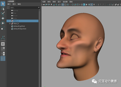 這兩個(gè)完整角色模型是兩個(gè)組。在大綱視圖中,將這兩個(gè)組展開(kāi),將兩個(gè)組中除人頭以外的其他元素全部選擇,將這些元素隱藏。只留下兩個(gè)人頭模型。