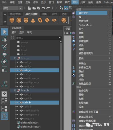 在Maya綁定模塊下,選擇第一個(gè)組中變形后的人頭模型,加選第二個(gè)組中變形前的人頭模型,執(zhí)行菜單命令“變形->融合變形”。這樣就給第二個(gè)組中變形前的人頭模型添加了一個(gè)融合變形器。該變形器是blend1。