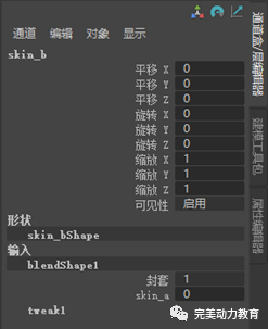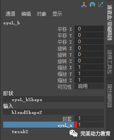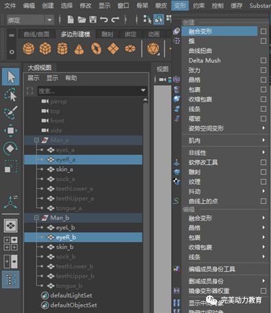 選擇第一個(gè)組中變形后的右眼模型,加選第二個(gè)組中變形前的右眼模型,執(zhí)行菜單命令“變形->融合變形”。這樣就給第二個(gè)組中變形前的右眼模型添加了一個(gè)融合變形器。該變形器是blend3。