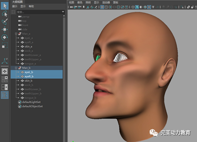 在大綱視圖中,將第二個(gè)組中變形前的兩個(gè)眼睛模型顯示出來(lái)。按照上述同樣的制作方法制作兩只眼睛的變形動(dòng)畫。