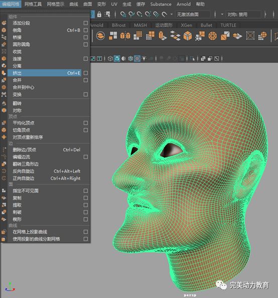 在Maya建模模塊下,選擇人頭模型,執(zhí)行菜單命令“編輯網(wǎng)格->擠出”。