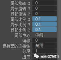 在人頭模型的變換通道欄中,找到擠出操作polyExtrudeFace1面板。在該面板中,將保持面的連接性設(shè)置為禁用,將局部比例設(shè)置為0.1。這樣,我們?cè)趫?chǎng)景視圖中可以看到,模型的每個(gè)面擠出后向各自的中心收縮。如果收縮后沿每個(gè)面的法線方向凸起,就可以形成針刺狀的空間造型。