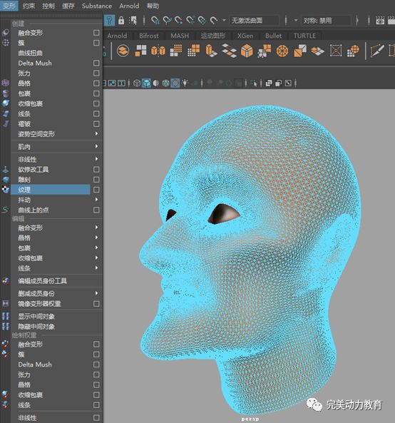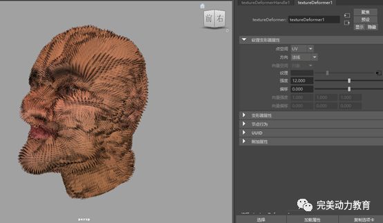 在Maya綁定模塊下,當(dāng)人頭模型上擠出前的所有面都被選擇時(shí),執(zhí)行菜單命令“變形->紋理”。我們給所有選中的面添加了一個(gè)紋理變形器。該變形器是textureDeformer1。