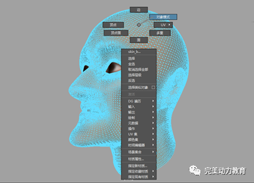 在場(chǎng)景視圖中,選擇人頭模型。點(diǎn)擊鼠標(biāo)右鍵,在右鍵菜單中執(zhí)行面編輯模式。讓人頭模型進(jìn)入面編輯模式。