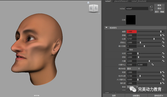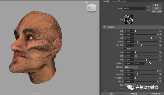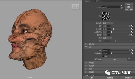 在紋理變形器textureDeformer1的屬性通道欄中,在紋理變形器屬性面板下,將方向設(shè)置為法線。這樣,收縮后的每個(gè)面沿法線方向凸起,就可以形成針刺狀的空間造型。在紋理上關(guān)聯(lián)2D紋理中的噪波紋理。該噪波紋理是noise1。這樣,就可以用噪波紋理來(lái)實(shí)現(xiàn)針刺狀空間造型的隨機(jī)起伏。