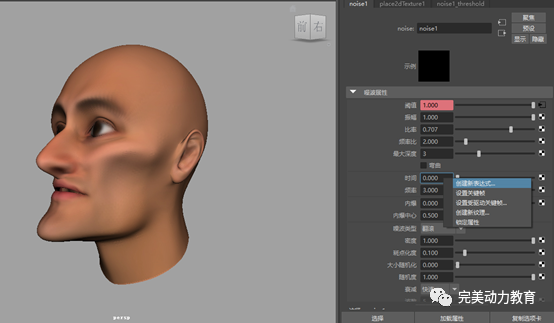 在打開(kāi)的表達(dá)式編輯器中,寫入如下表達(dá)式:noise1.time=time;該表達(dá)式所起的作用是,在播放動(dòng)畫時(shí),讓噪波紋理noise1的時(shí)間屬性隨時(shí)間的改變而改變。這樣,播放動(dòng)畫時(shí),噪波紋理將發(fā)生隨機(jī)變化,從而針刺狀空間造型在人頭模型的表面上呈現(xiàn)出隨時(shí)間變化而隨機(jī)凸起回落的動(dòng)畫效果。