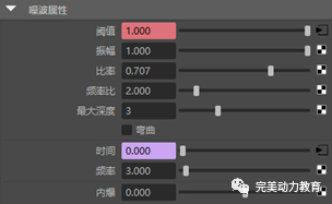 在噪波紋理noise1的屬性通道欄中,在噪波屬性面板下,將頻率設(shè)置為3。這樣,針刺狀空間造型的凸起效果不會(huì)讓人感到過(guò)于瑣碎。