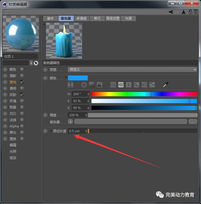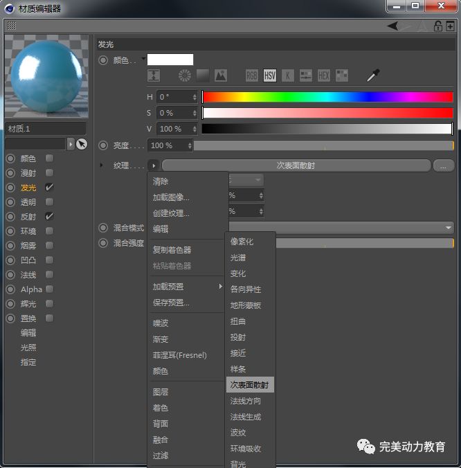 1.把SSS材質(zhì)放到發(fā)光通道;(位置在:紋理--效果--次表面材質(zhì))
