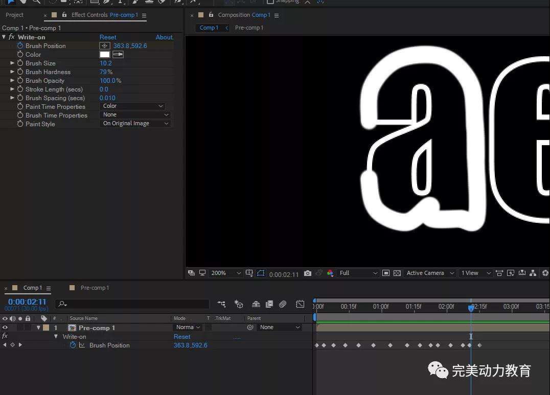 利用write on命令做出文字動畫,在文字合成內部新建一層黑色圖層作為BG層,打組合成然后給上write on命令K筆刷位置的關鍵幀幀。