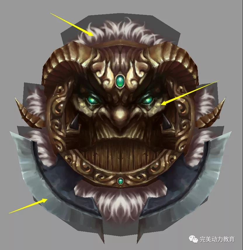 紅色箭頭部分為整個道具中的主要部分(頭部面積較大,復(fù)雜的結(jié)構(gòu)以及繁瑣的花紋),是整個盾的中心點,在uv中所占像素比重最多,可以將獸頭uv這部分放大。