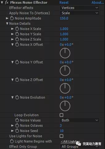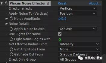 設(shè)置好屬性以后將燈光的強(qiáng)度加入關(guān)鍵幀動(dòng)畫,可以控制粒子產(chǎn)生擾亂的時(shí)間,全部設(shè)置好之后可以將第二個(gè)噪波屬性復(fù)制到其他的地球圖層上 (注意:復(fù)制的時(shí)候要選擇Plexus特效,才能復(fù)制出新的噪波,這樣就不會(huì)覆蓋掉原始的噪波復(fù)制后的特效排列);