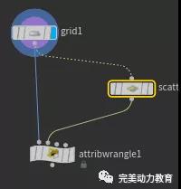 建立一個(gè)網(wǎng)格,建立一個(gè)scatter節(jié)點(diǎn),將Force total count 改為5,在建立一個(gè)attribwrangle 節(jié)點(diǎn),分別連上去。