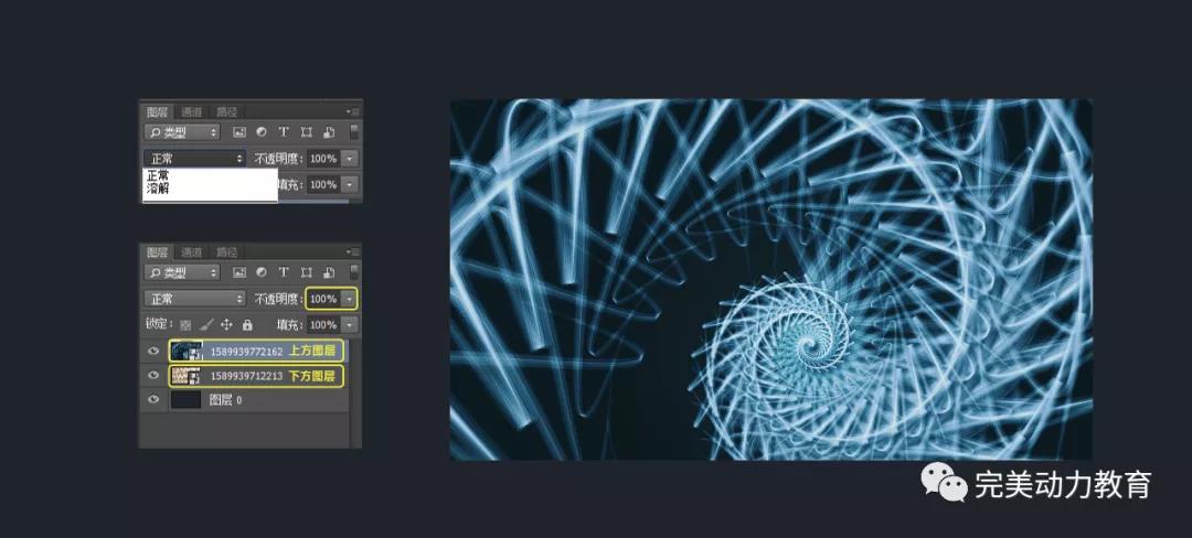 其中,在正常混合模式下,當不透明度在100%的時候(也就是完全不透明),上方圖層將完全遮住下方圖層。隨著上方圖層不透明度的降低,上方圖層也就會一點點變透明,當上方圖層不透明度為0%時,我們就看不到上方圖層了。