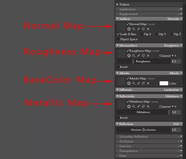 需要注意的幾個地方是,檢查Microsuface這一欄里面的右側(cè)是不是選擇的Roughness以及Reflection這一欄的右側(cè)是不是選擇的metalness選項,如果不是,需要大家改一下。