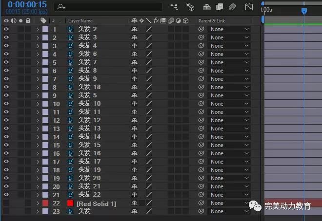 9、在AE中,將頭發(fā)先預合成,然后用鋼筆工具按照從前往后的順序將頭發(fā)再分層,分層的時候可以借助一個純色層,以便觀察哪些頭發(fā)已經(jīng)單獨繪制出來了。