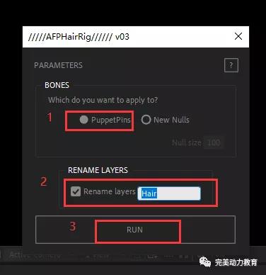 15、選中所有的頭發(fā)圖層,窗口菜單,找到腳本并運行使用 AFPHairRig_03腳本,可修改變形控制器的名稱,此時預覽動畫,頭發(fā)已經(jīng)飄動起來了。