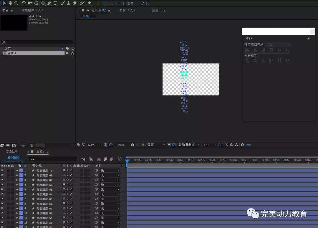新建合成,選擇橢圓工具,按住“Shift”繪制正圓,把中心點(diǎn)放到圓中心,復(fù)制多個圓,分散開,再復(fù)制以上所有圓,移動位置,改變顏色,縮小圓。多次重復(fù)以上操作,把圓擺成長條。想要拉的更長些可以復(fù)制兩個圓放到最上方,再復(fù)制兩個圓放到最下方。