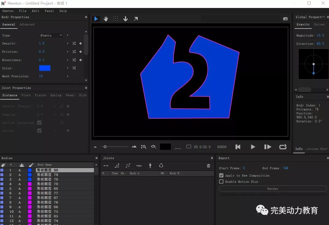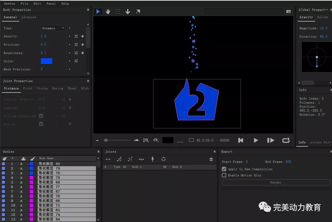 然后打開合成--Newton牛頓插件,選擇2的形狀層,把Mesh Precision網(wǎng)格精度改為10,把Bounciness碰撞改為0.1,Type改為Static靜止?fàn)顟B(tài)。