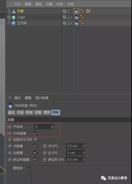 3、把平面C掉,調(diào)整布料標(biāo)簽參數(shù),在高級(jí)里面把子采樣提高,會(huì)增加布料計(jì)算精度,但是也會(huì)讓計(jì)算更卡,根據(jù)情況來調(diào)整,這里我調(diào)整到5,勾選本體碰撞。