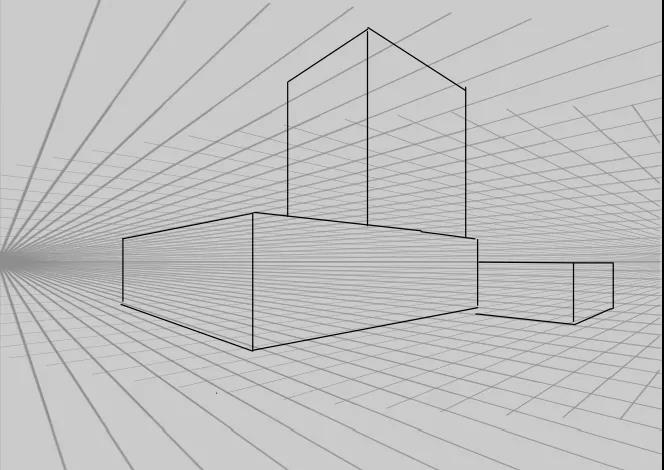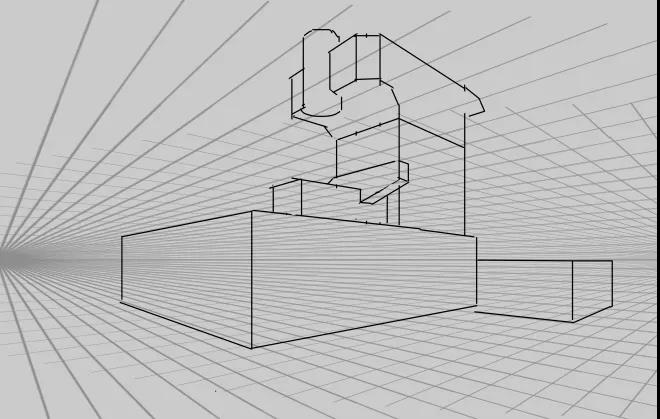 新建畫布,新建圖層避免在背景層上畫設(shè)計,在畫面中畫一個“兩點透視”的透視線,因為兩點透視相對來說比較簡單,也很適合做設(shè)計圖的展示,在這個透視基礎(chǔ)上畫三個大小不一,有主次的普通幾何體。