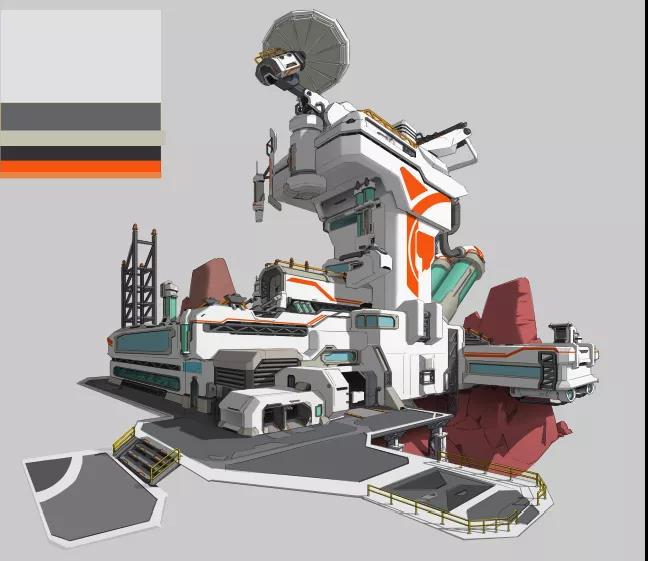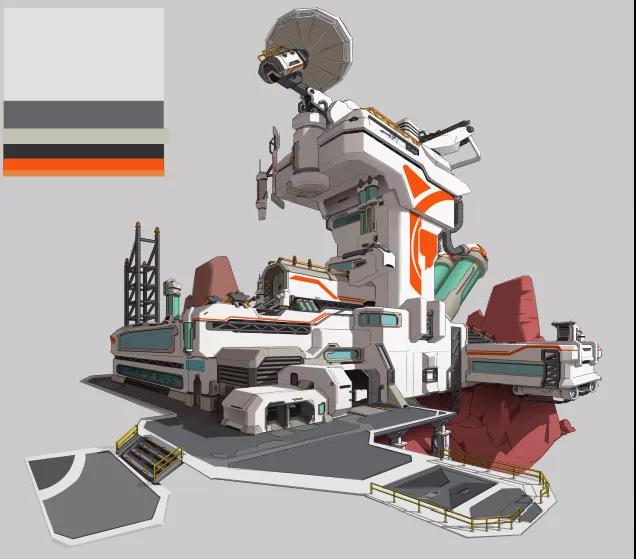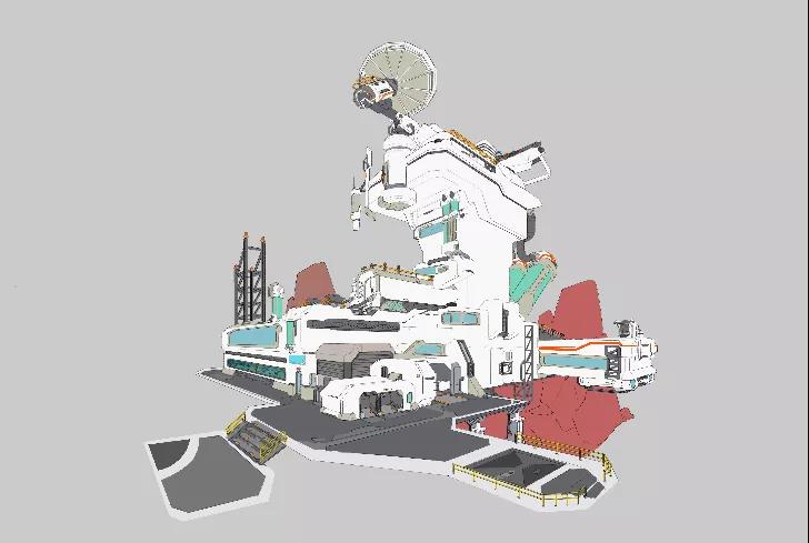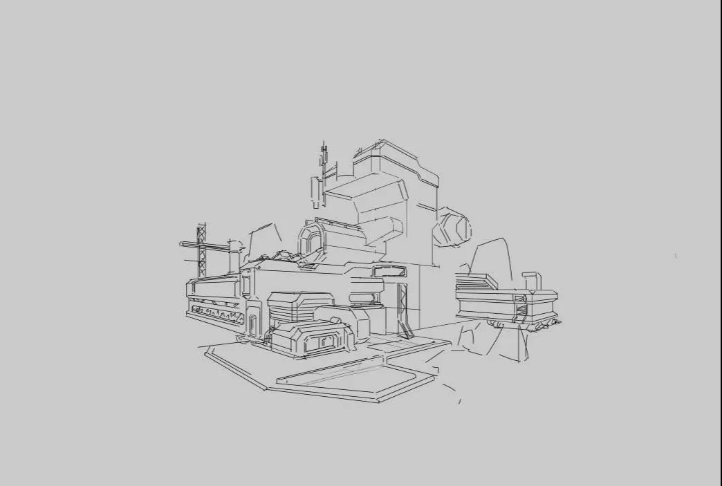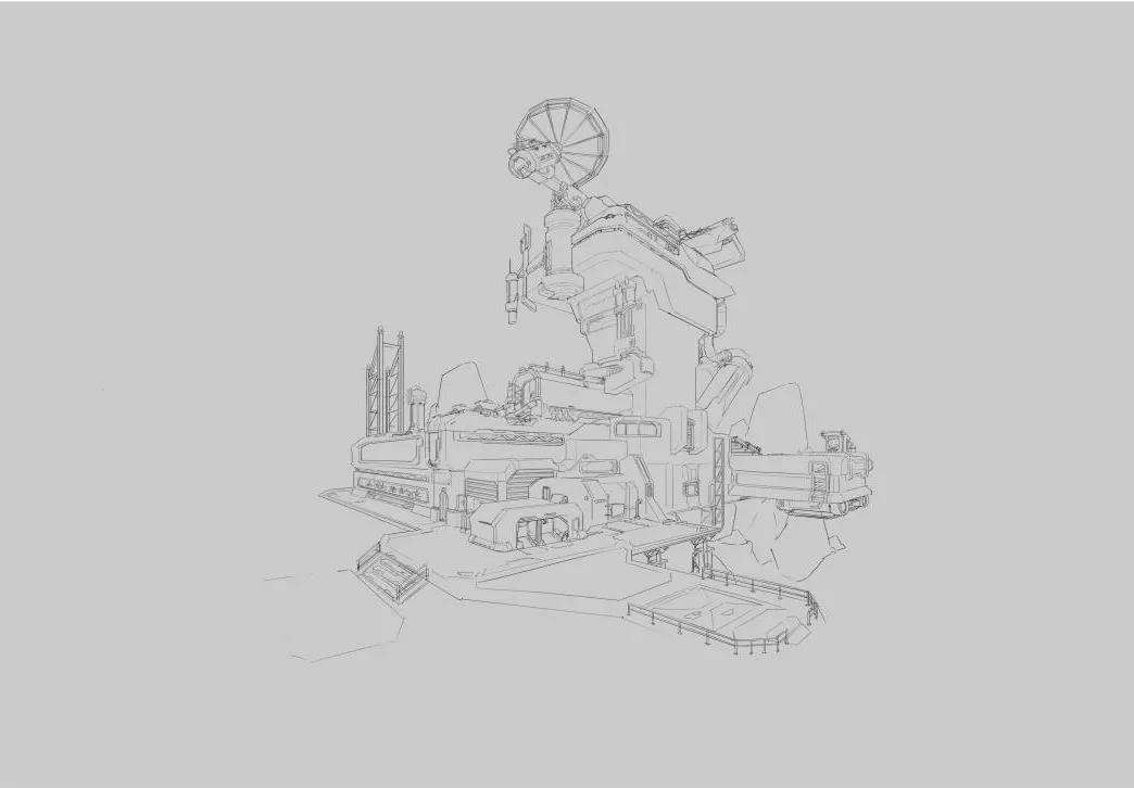 在建筑主題物上方,加上一個明確能夠體現(xiàn)建筑功能性的設(shè)計雷達,將設(shè)計做成一個雷達信號站的主題,并且將建筑的整體設(shè)計全都根據(jù)找到的素材進行優(yōu)化。(注意:在設(shè)計前的整理參考的工作是極其重要的。)草稿到線稿階段可能,重復(fù)畫幾遍,才能把結(jié)構(gòu)穿插交待清楚。主體物高度不夠也需要調(diào)整。