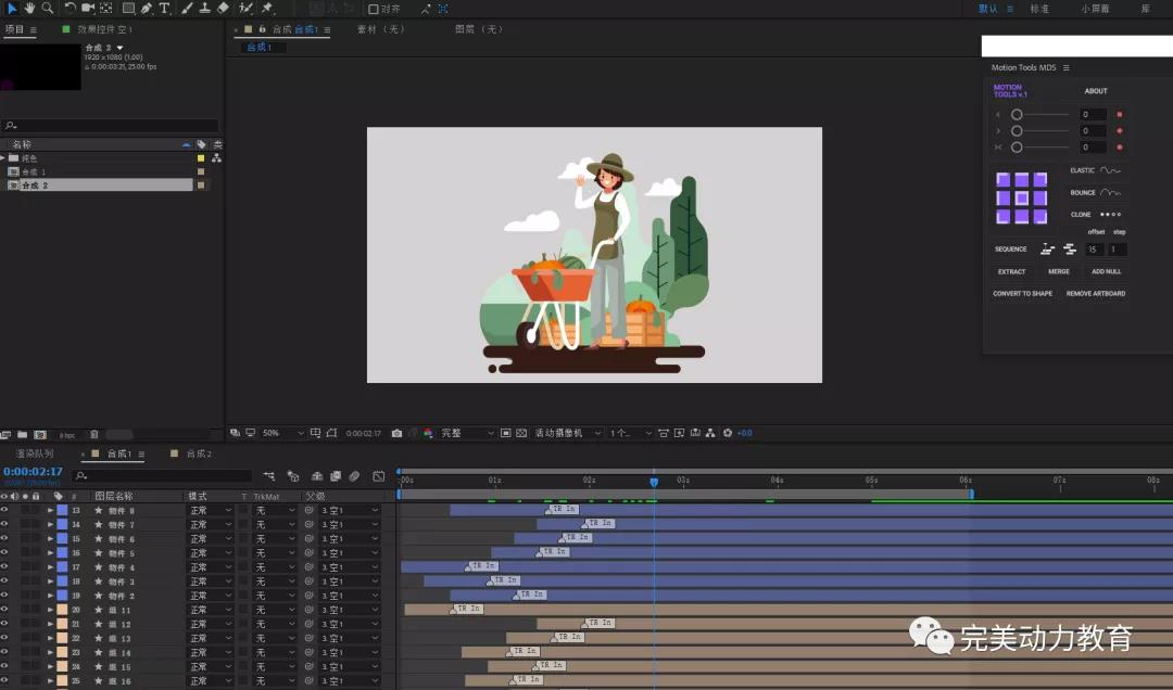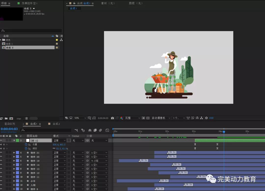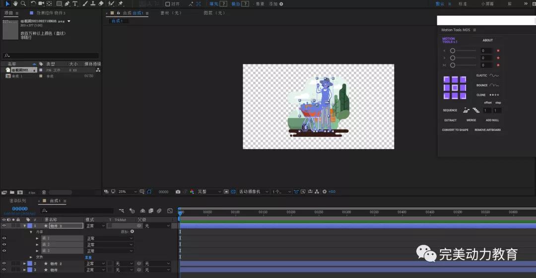 第五步:同樣的方法給背景添加動畫,給人物添加從右進(jìn)入動畫。選中所有圖層,打開motion tools點(diǎn)擊ADD null 添加空對象,給空對象做縮放和位移動畫,實(shí)現(xiàn)整體的縮放效果。